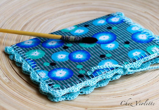 I love mixing materials ! Paper, cloth, cotton for example.So, covering with nice fabric a notebook, embroidering the cardboard cover and adding a delicate crochet edging is a real pleasure for me. I mix materials and I like the result.